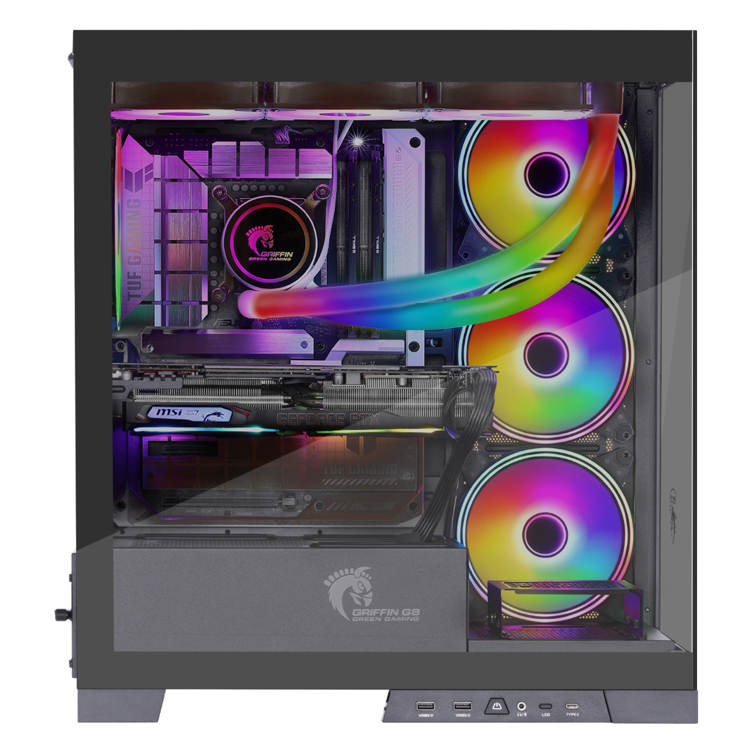 کیس رده بالا مخصوص بازی GRIFFIN G8 / گریفین جی 8 اولین کیس آکواریومی و در عین حال ماژولار گرین / GREEN محسوب می شود. ویژگی های کم نظیری مانند طراحی ماژولار بخش های مختلف کیس، همراه داشتن 3 عدد فن 140mm پره معکوس بر روی سینی مادربرد، یک عدد فن 140mm بر روی سینی پشتی، پشتیبانی از مادربردهای نسل جدید Back connect، نورپردازی ARGB فن ها به لطف هاب 6 کاناله با قابلیت همگام سازی نورپردازی و سرعت فن ها با مادربرد (MB SYNC) و کنترل از راه دور رادیویی (RF)، قابلیت نصب کارت گرافیک به صورت عمودی، امکان نصب خنک کننده های آبی مجهز به رادیاتور 280/360mm در کنار اسکلت فوق العاده مستحکم با طراحی مدرن و کم ترین محدودیت در نصب قطعات رده بالا این کیس را به انتخابی بسیار هوشمندانه برای سیستم های مدرن گیمینگ تبدیل کرده است.